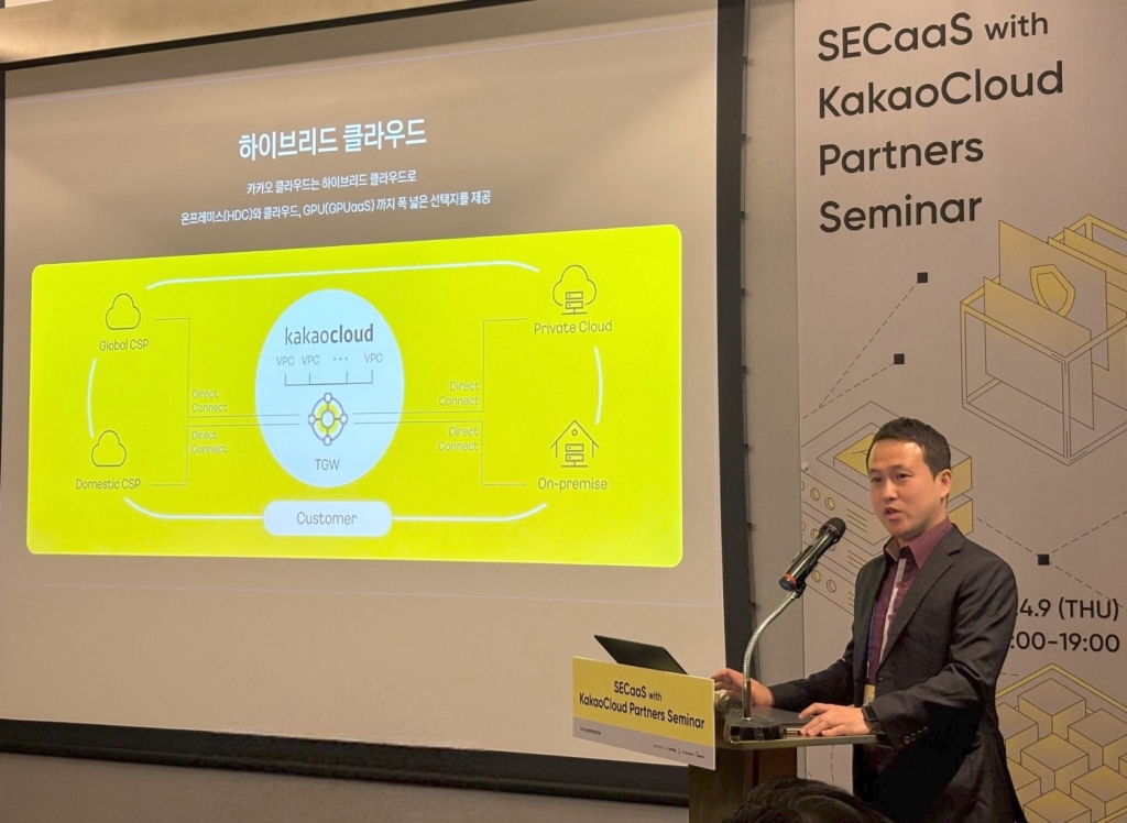 카카오클라우드 기반의 클라우드 보안 서비스 ‘SECaaS(서비스형보안)’에 대해 발표하고 있다.